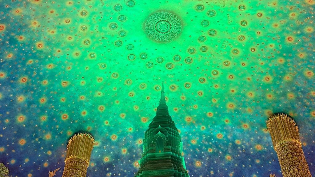 ワット・パクナムは、近年観光客に人気の高い寺院です。特に有名なのは、幻想的なエメラルドグリーンの天井画と仏塔内部のガラスの仏塔(ガラスパゴダ)です。インスタ映えスポットとして若者や観光客に人気で、静かで神秘的な雰囲気を楽しめます。