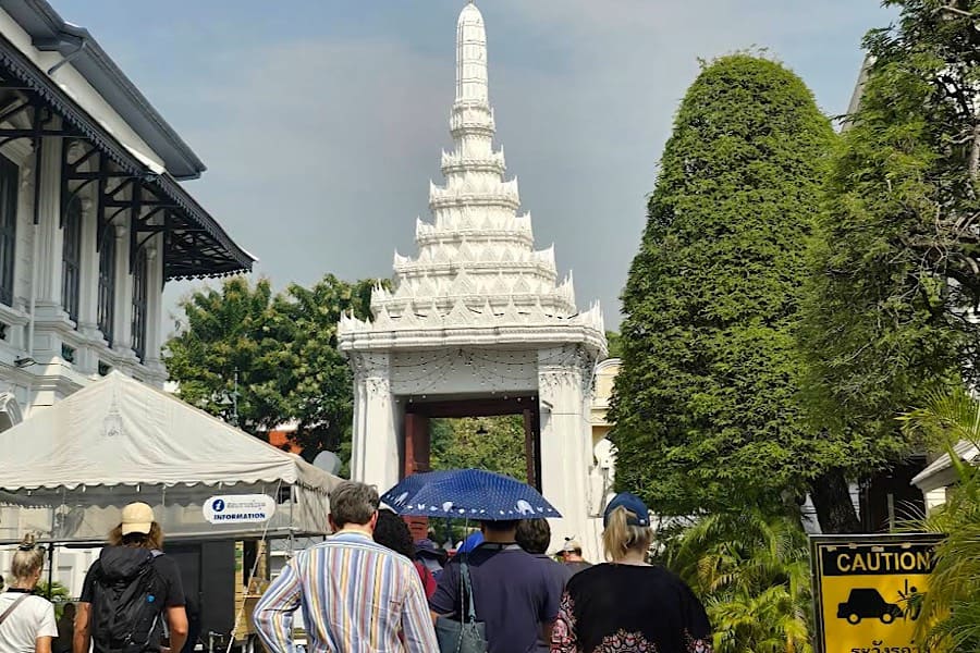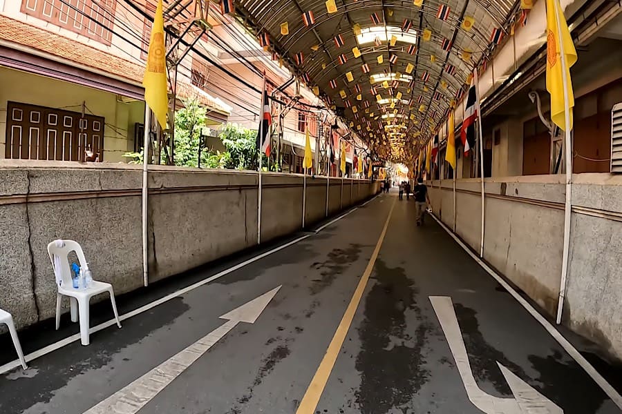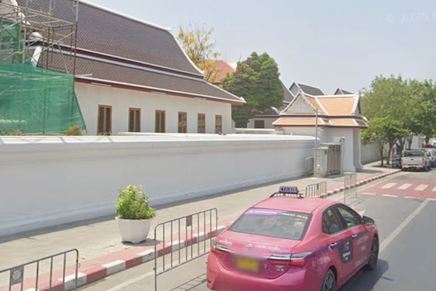 地上に出ましたら、そのまま進行方向へ向かって、歩道を直進してください。直進すると、すぐにワット・ポーの敷地の白い塀が見えてきます。この塀沿いに進むと、観光客向けの入口に到着します。