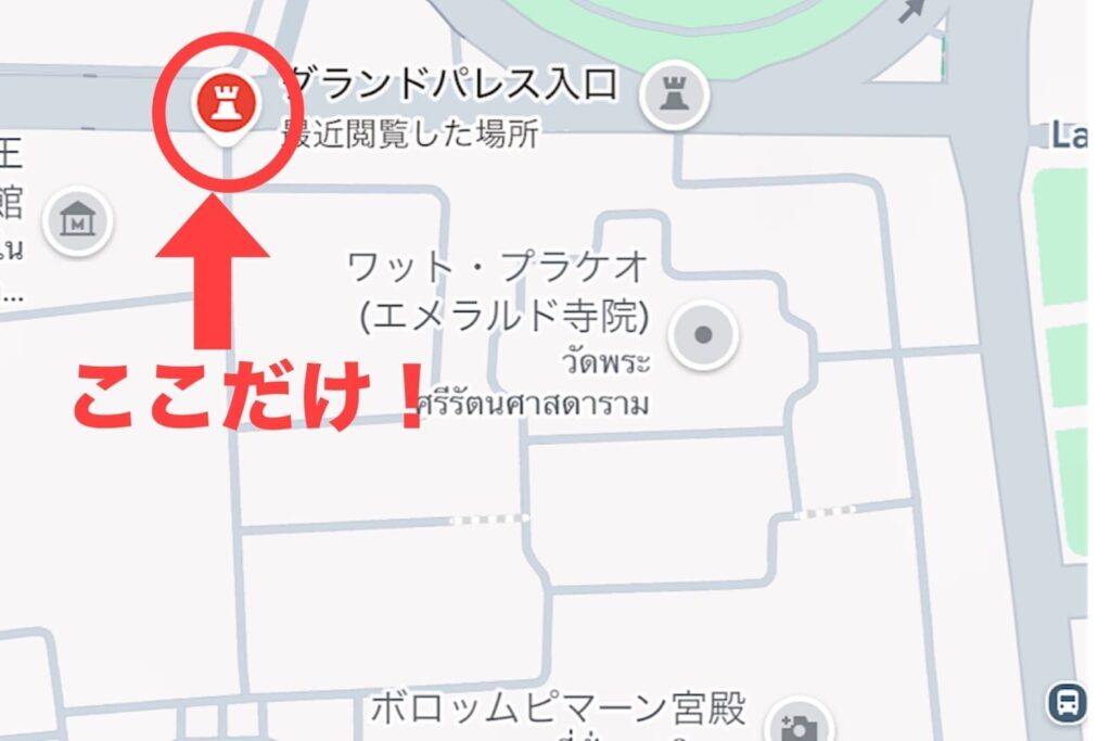 まずワット・プラケオに行く際には重要な注意点が一点あります。それは観光客用の入口が一箇所しかないということです。敷地が広大なため、必ず事前に入口を押さえてから行くようにしましょう。以下の地図で示したところが入口です。