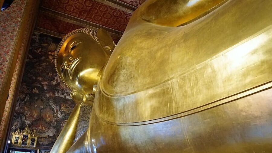 ワット・ポーは、バンコクで最も古く大きな寺院の一つで、「寝釈迦仏(ねしゃかぶつ)」が有名です。全長46メートルの巨大な黄金の寝釈迦像が安置され、訪れる人々を圧倒します。