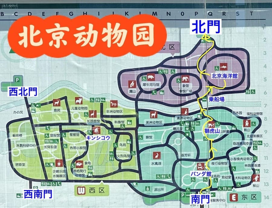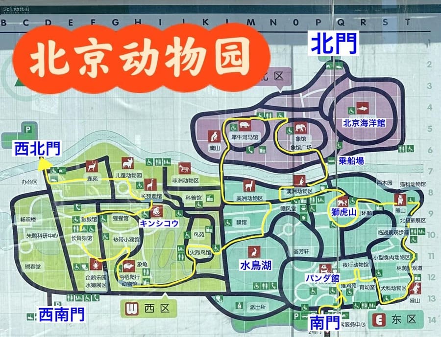 キンシコウを見た後に西北門から出るルートですが、北京海洋館や頤和園まで行く船に乗りたければ、北エリアに戻ってください。